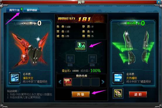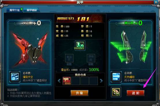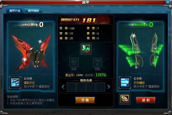 翼甲升级:翼甲升级界面又有翼甲进阶,翼甲升级/进阶都可以永久增加人物属性,翼甲升级失败时有几率会降级。翼甲进阶必成功。