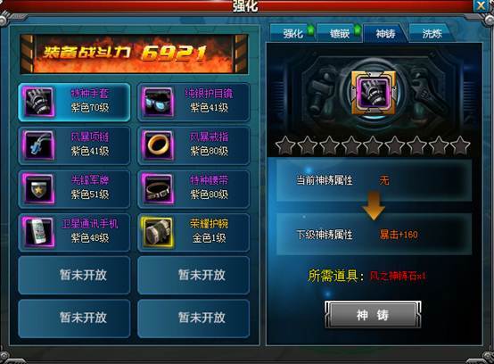 当背包内有对应的神铸所需要的道具时,系统将自动出现神铸按钮,提示可神铸,点击下面【神铸】即可。神铸可以带来额外的属性,每个装备神铸带来的属性不同,神铸星级越高,带来的属性就越高。神铸界面会显示当前装备的星级的。