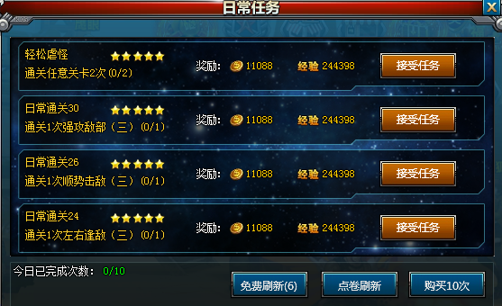 玩家每天可以完成10次日常任务。多余次数需要花费点券购买。